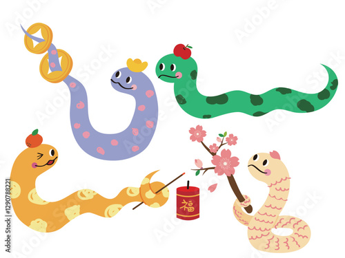 © Hong Hua Hua, Fototapeta premium Cute Cartoon Snake Doodle Sticker Illustration Set