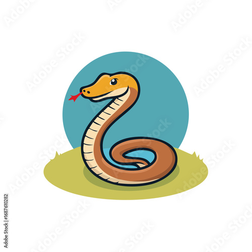 Fototapeta premium Cute cartoon snake with forked tongue coiled on grass patch illustration