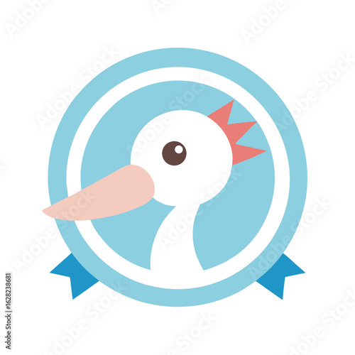 Fototapeta premium Cute cartoon stork bird head in a blue circle with ribbon animal