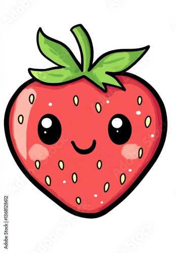 Obraz premium Cute Cartoon Strawberry with Smiling Face and Green Leaves