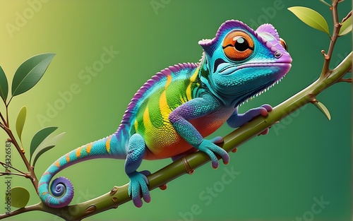 © Janis, Fototapeta premium Cute Cartoon Style Chameleon Character On Olive Branch Banner Solid Gradient