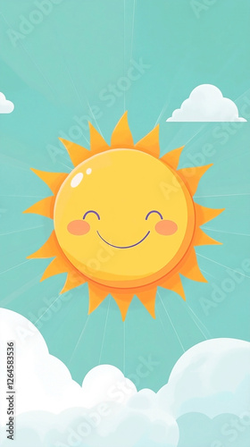 Fototapeta premium Cute cartoon sun with a simple flat design featuring a smiling face and surrounding clouds