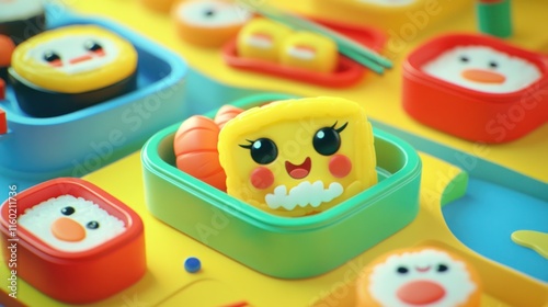Obraz premium Cute cartoon sushi in colorful bento box.