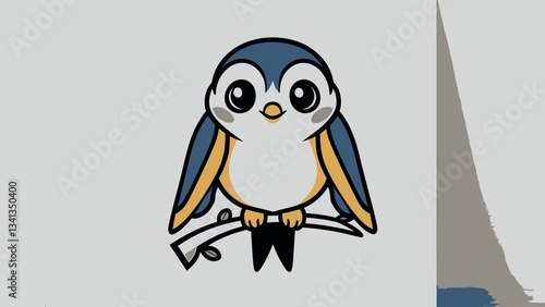 Naklejka premium Cute Cartoon Swallow Perching on a Branch with Clouds in the Background