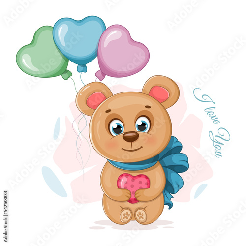 Obraz premium Cute cartoon teddy bear with a heart and balloons