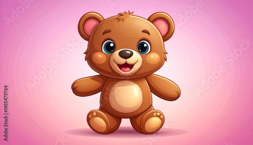 © Yelloone, Obraz premium Cute cartoon teddy bear with big blue eyes and a happy smile, sitting on a pink gradient background.