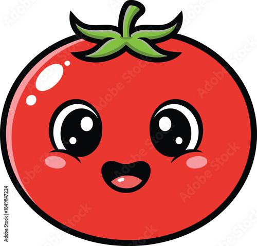 Fototapeta premium Cute cartoon tomato with happy face and green leaves on top