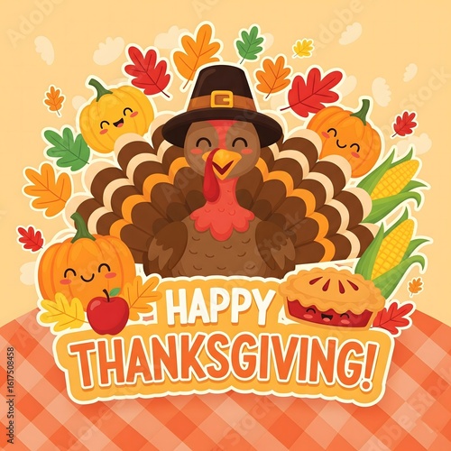 Obraz premium Cute cartoon turkey wearing a pilgrim hat surrounded by fall harvest elements and happy thanksgiving text