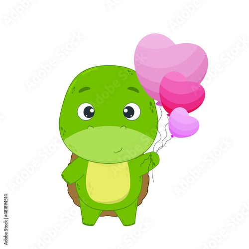 Obraz premium Cute cartoon turtle character holding balloons.Turtle isolated on white background.Valentine s day card design.