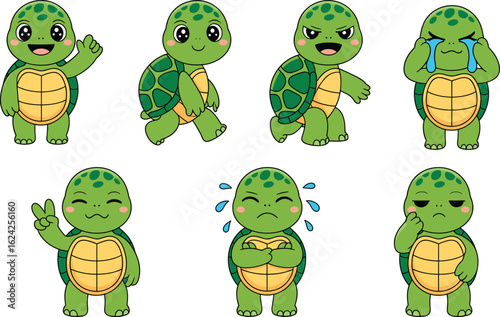 Obraz premium Cute cartoon turtle character set, various emotions, kawaii turtle expressions, baby turtle mascot, vector illustration for kids design, adorable animals