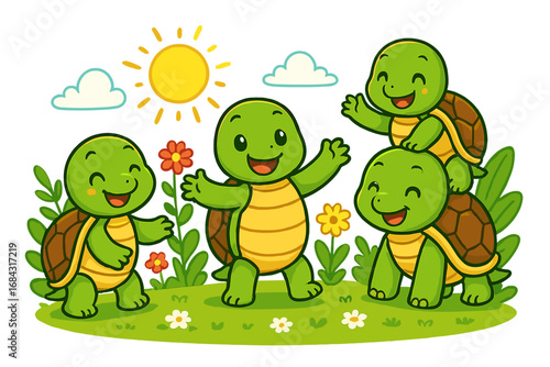 Obraz premium Cute cartoon turtle characters play together. Happy tortoise friends in nature. Cheerful reptile mascot family enjoying a sunny summer day. Kawaii animal friendship and joy concept.
