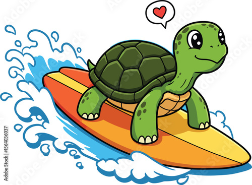 Fototapeta premium Cute cartoon turtle surfing on a wave with a heart symbol above its head...