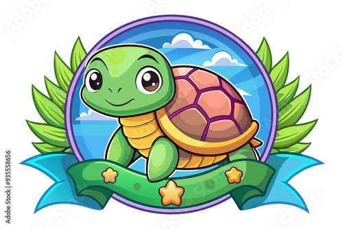 Fototapeta premium Cute Cartoon Turtle with Green Leaves and Blue Ribbon