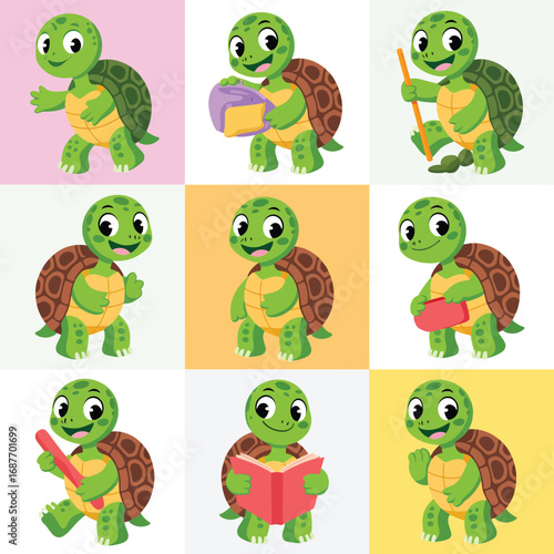 © Stock bd, Fototapeta premium Cute cartoon turtles in various poses and activities