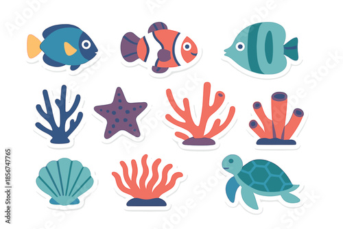 Fototapeta premium Cute Cartoon Underwater Sea Creatures and Coral Stickers