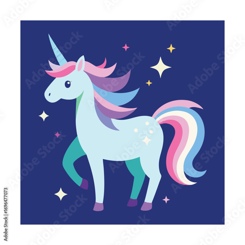 © Shakil, Fototapeta premium Cute cartoon unicorn with rainbow mane and tail on dark blue background