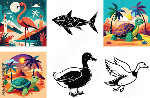 © Png stock, Obraz premium Cute cartoon vector animal and bird illustrations set with seamless nature patterns for design