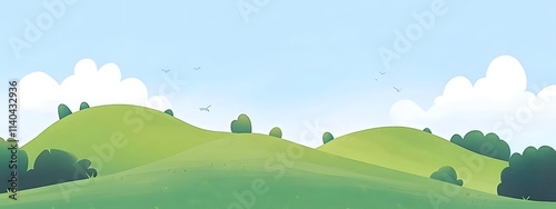 Fototapeta premium Cute cartoon vector-style landscape view of green fields with a blue sky, simple flat design