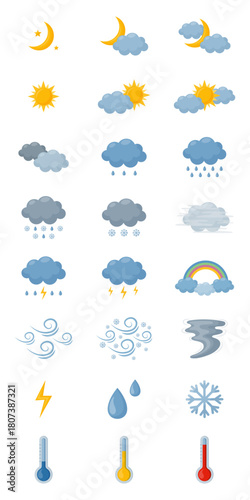 © Anna, Fototapeta premium Cute cartoon weather icons collection isolated on transparent background.Moon, stars, sun, clouds, rain, snow, wind, rainbow, lightning, temperature.Elements for weather forecas.Vector illustration.