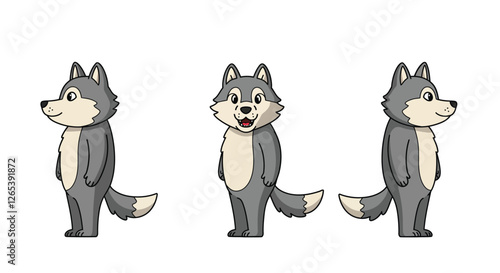 Obraz premium Cute cartoon wolf character in three poses, flat design style, vector illustration