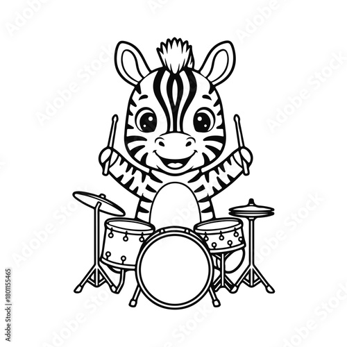 © sasha15, Fototapeta premium Cute cartoon zebra playing drums in black and white line art, funny animal musician with happy face, zebra drummer, cute zebra, funny animal, music art, cartoon drummer, kids illustration