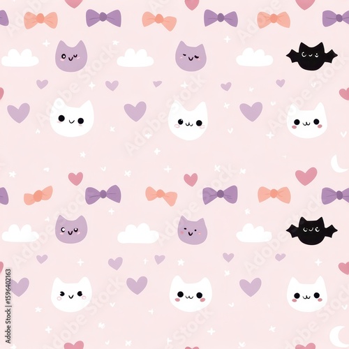 © PalaG, Fototapeta premium Cute Cat and Bat Pattern with Bows on Soft Pink Background