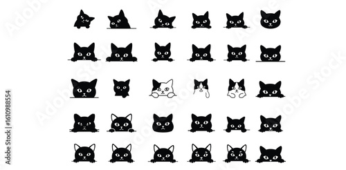 © Panji, Naklejka premium Cute Cat Face Icon Set – Vector Silhouettes of Peeking Cats in Various Styles