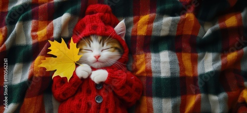 Naklejka premium Cute cat in red hoodie with autumn leaf, cozy blanket background, playful...