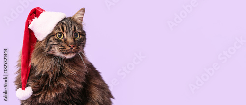 © Pixel-Shot, Naklejka premium Cute cat in Santa hat on lilac background