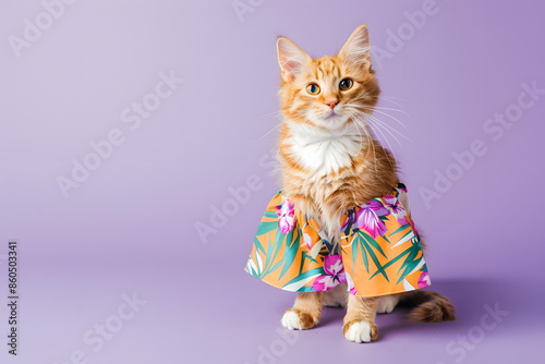 © Pacharee, Obraz premium Cute cat in summer dress on purple background.