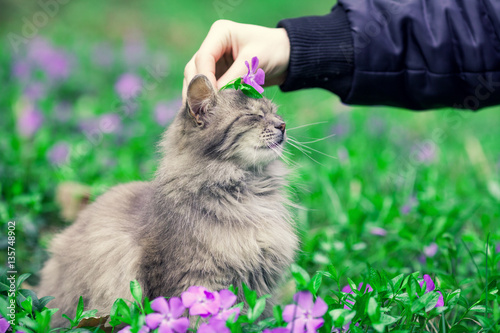 © vvvita, Obraz premium Cute cat lying on the periwinkle lawn with flower on the head.