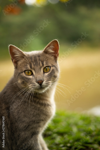 © Johnatan, Fototapeta premium Cute cat on the grass outdoors backlit