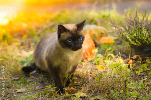 © lanara@bk.ru, Fototapeta premium Cute cat sitting with Halloween pumpkins