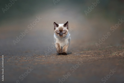Fototapeta premium Cute cat walking outdoor. Sacred Burmese kitten running in nature.