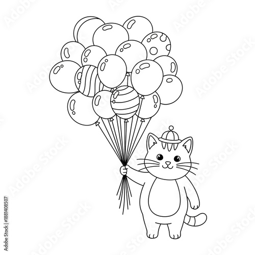 © Faiz, Fototapeta premium Cute Cat Wearing Hat Holding Bunch of Balloons Coloring Page.