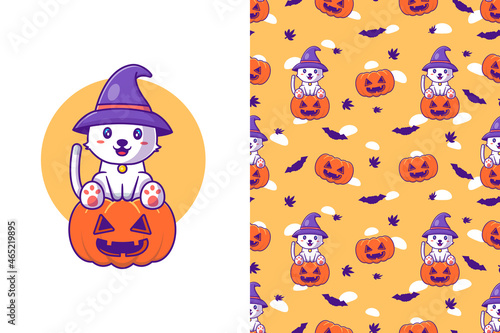 Obraz premium Cute cat witch with pumpkin happy halloween with seamless pattern