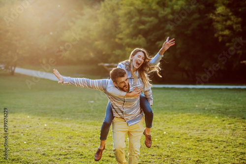 © Dusan Petkovic, Fototapeta premium Cute caucasian couple in love having piggyback and having fun in nature.