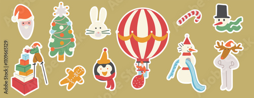 Fototapeta premium cute character sticker set in shape doodle style in vector for Christmas and New Year decor. Elements for poster sticker design logo decoration