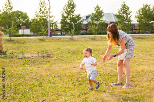 Fototapeta premium Cute cheerful child with mother play outdoors in park