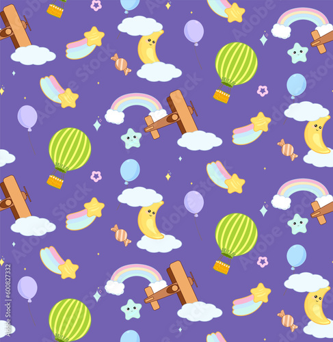 © Nataliia Zotova, Fototapeta premium Cute cheerful kawaii cartoon background with emotional adorable moon, stars, rainbows, comets, airplanes and hot air balloon