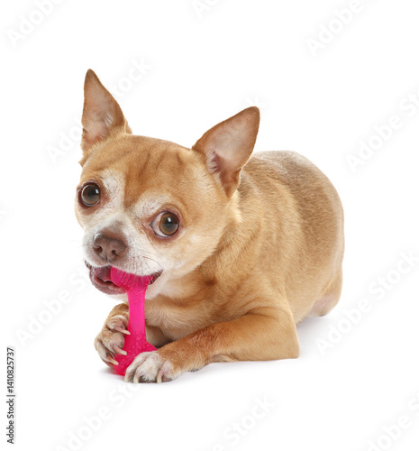 Obraz premium Cute chihuahua dog chewing toy on white background