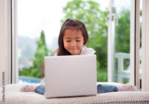 © Tyler Olson, Naklejka premium Cute Child Using Laptop Computer