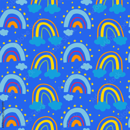 © Marina, Fototapeta premium Cute childish style seamless pattern with rainbow on blue background