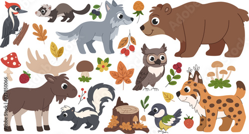 Fototapeta premium Cute childrens forest animals set. Forest animals, birds and elements set. Bear, moose, lynx, wolf, other animals and birds. Mushrooms, berries and leaves. Autumn forest collection. White background.
