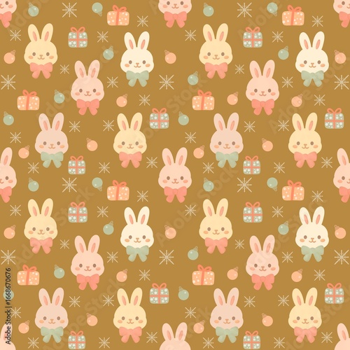 Obraz premium Cute Christmas Bunny Pattern – Kawaii Holiday Rabbits with Gifts