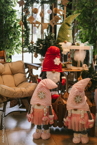 Obraz premium Cute Christmas gnomes or dwarfs in the room with other festive decorations.