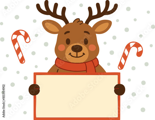 © Shaman, Fototapeta premium Cute Christmas Reindeer with Blank Sign and Candy Canes