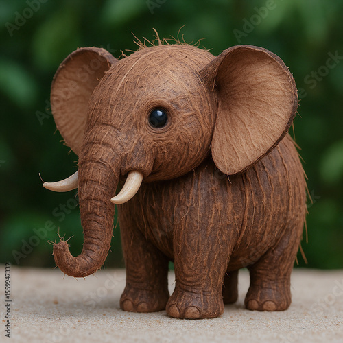 © Yume, Fototapeta premium Cute Coconut Elephant Figurine on Sand with Green Background