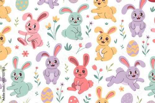 © Lubos Chlubny, Obraz premium Cute colorful easter bunnies seamless spring pattern