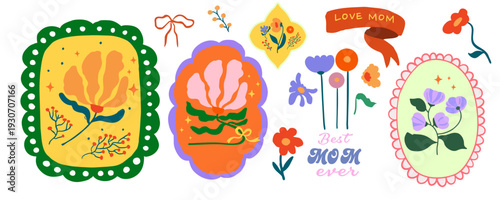 Fototapeta premium Cute colorful mother’s day element object set with bow,ribbon,frame,vase and floral Illustrations for invitation design